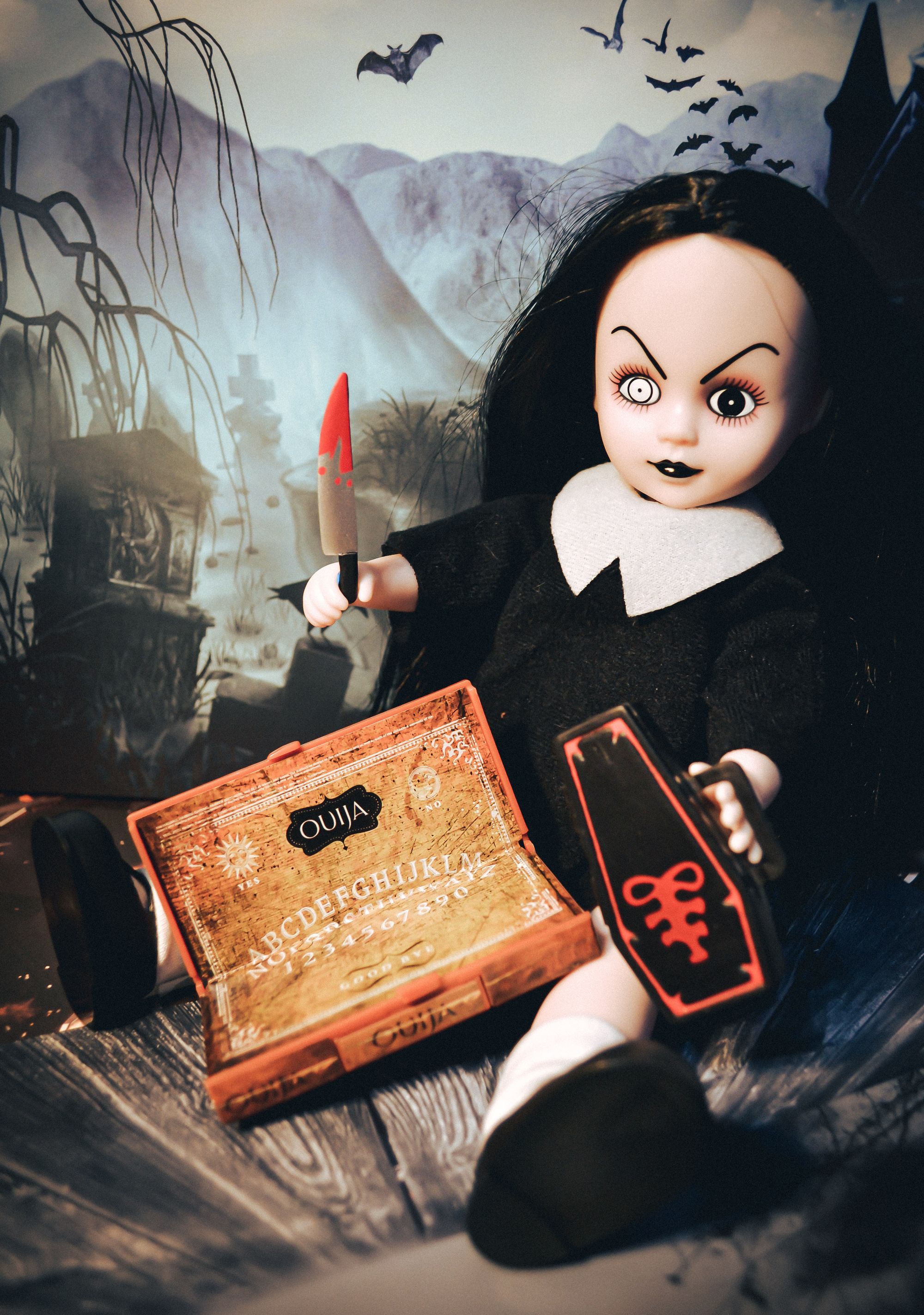 A: I first began collecting Living Dead Dolls about 6 years ago, I found my first doll secondhand online and that opened a whole new world. Living Dead Dolls have been around for more than 20 years now, I had a lot of catching up to do. The first doll I specifically looked for was Sadie, she wears a Wednesday Addams-esque outfit, comes with a black bouquet, butcher knife and coffin shaped purse. This doll is the mascot for the line and has also had the most versions or "resurrections". I have 3.