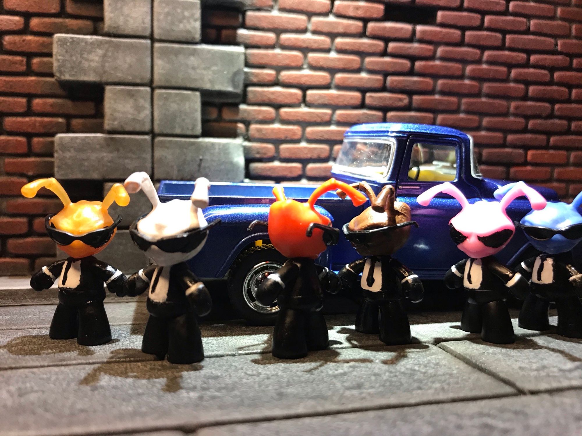 Inspiration: Quentin Tarantino’s reservoir dogs intro of the cast walking out in slow motion. to DJ K-Billy’s super sounds of the ’70s. while the song " Little Green Bag” by George Baker. and noticed Mez was giving out colored grubs just missing Mr. White & Mr. Brown. so all I had to do was paint two grubs and black and white suits. and found a perfect-scale pickup truck that resembles the one at the beginning of the scene.