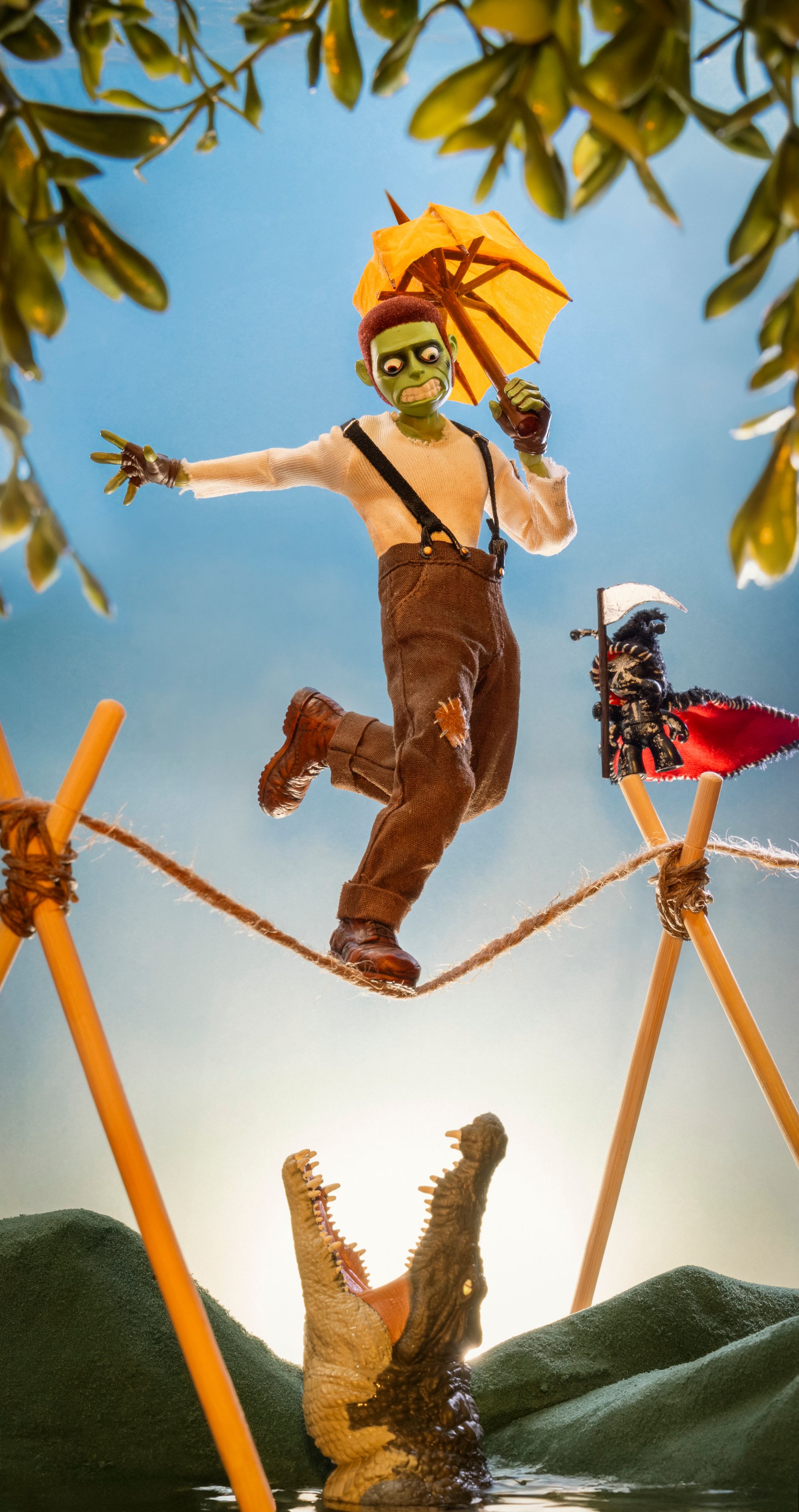 Inspiration: The Haunted Mansion is my favorite Disney attraction. Stepping inside, you're instantly in an octagonal gallery with four eerie "guests." One, a seemingly safe young lady with a parasol. As the door closes behind you, the illusion shatters, revealing her tightrope act over an alligator's jaws. Inspired by the scene, I recreated it with our sketchy friend, Jackie. I made a skeleton parasol from chopsticks, toothpicks, and a pen reservoir, added orange petals, and built a tightrope over a bowl of water. With a blue background, some lighting, Fiona the alligator, and a custom petite grim reaper mez-itz in an improvised black robe, it came to life.