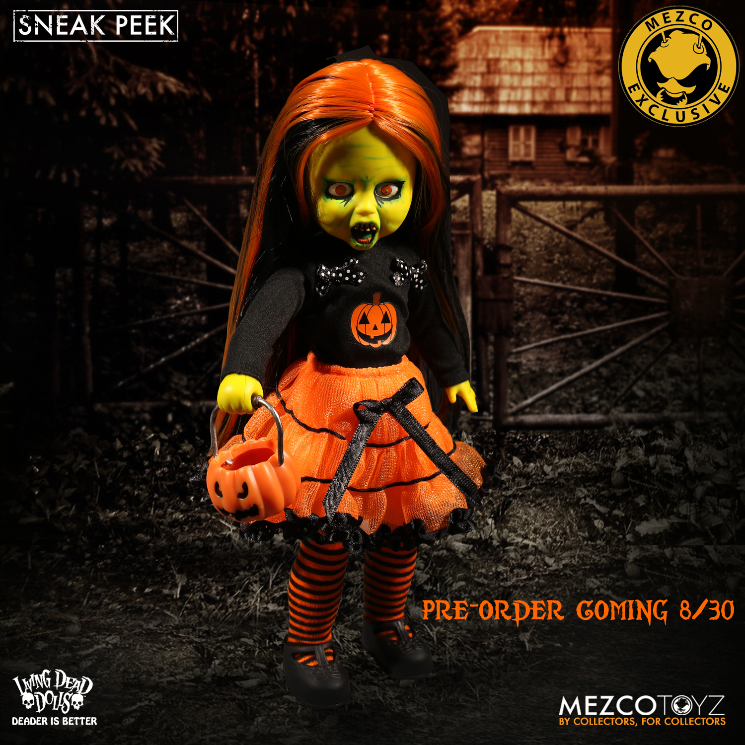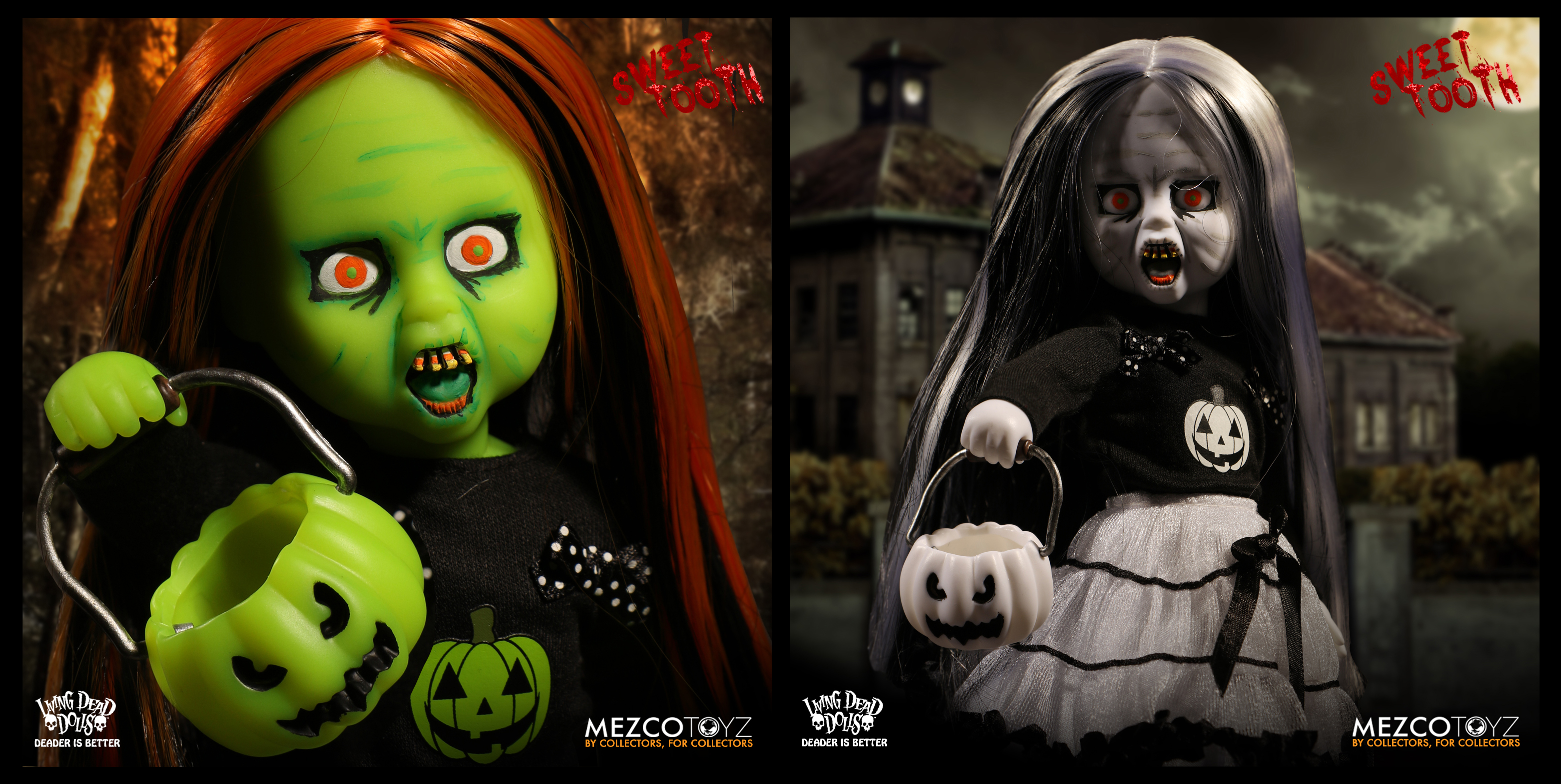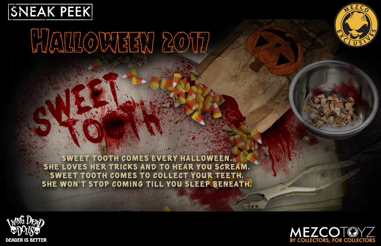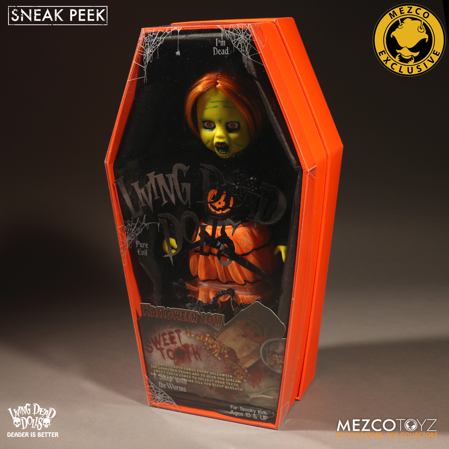 Meet Living Dead Doll Sweet Tooth. Inspired by trick-o-treaters on the hunt for candy, Sweet Tooth embodies the spirit of Halloween. Every detail, from her orange and black striped stockings, and silk screen pumpkin shirt, to her candy corn shaped teeth, pay tribute to the night that celebrates fear. The back of her sweater has "Living Dead Dolls Halloween 2017" on it, so you can always remember when the wicked little trick-or-treater entered your life. As with all of the Living Dead Dolls she comes packaged in her coffin display, with a death certificate describing her haunting fate.