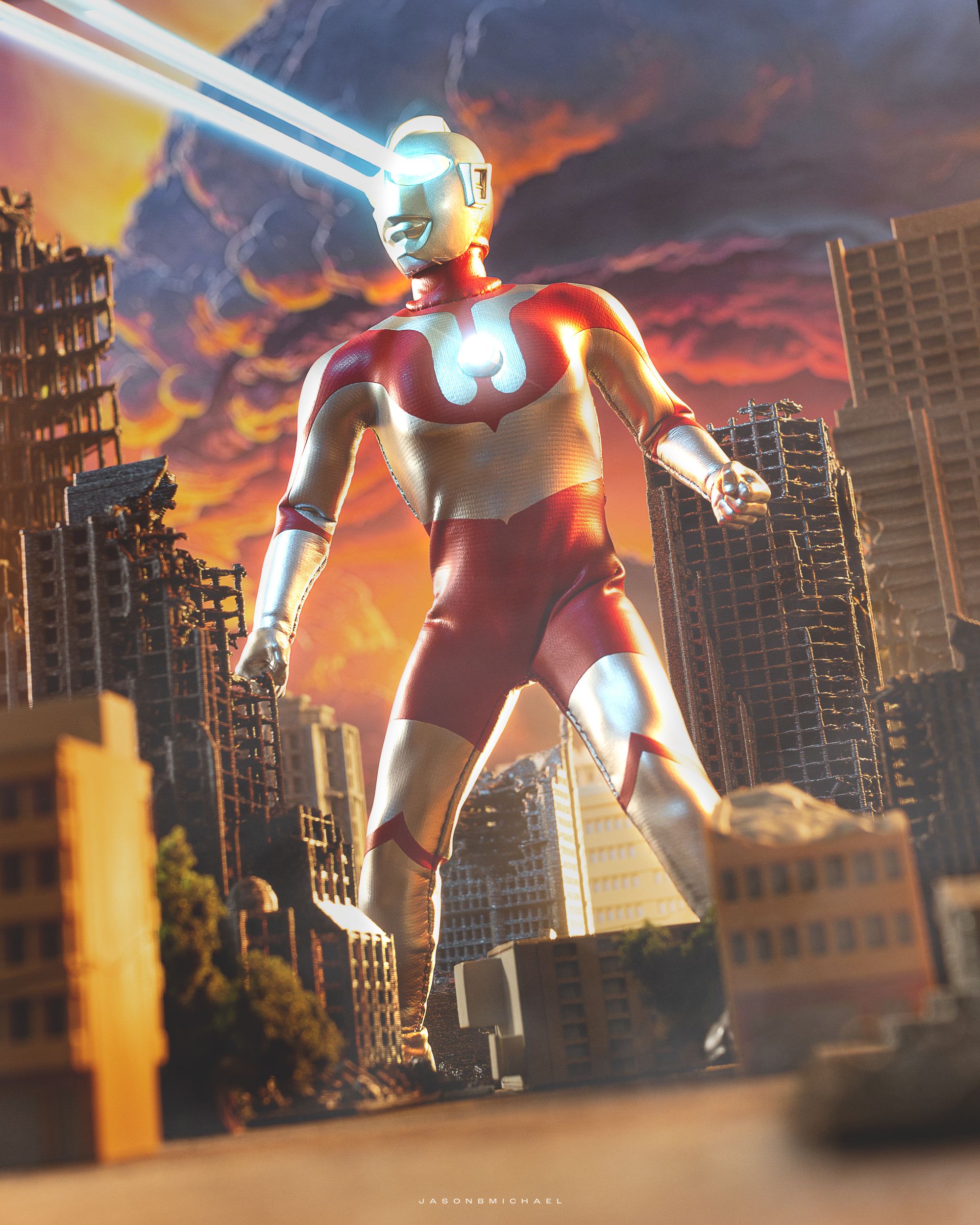 Inspiration: The inspiration for this shot kind of comes from those old, heroic illustrations that you would find like on a wartime poster. To me , Ultraman isn’t just a hero, but a true protector of the people. So, I thought it would be cool to set him up standing vigilant while the city sleeps, ready to defend humanity.