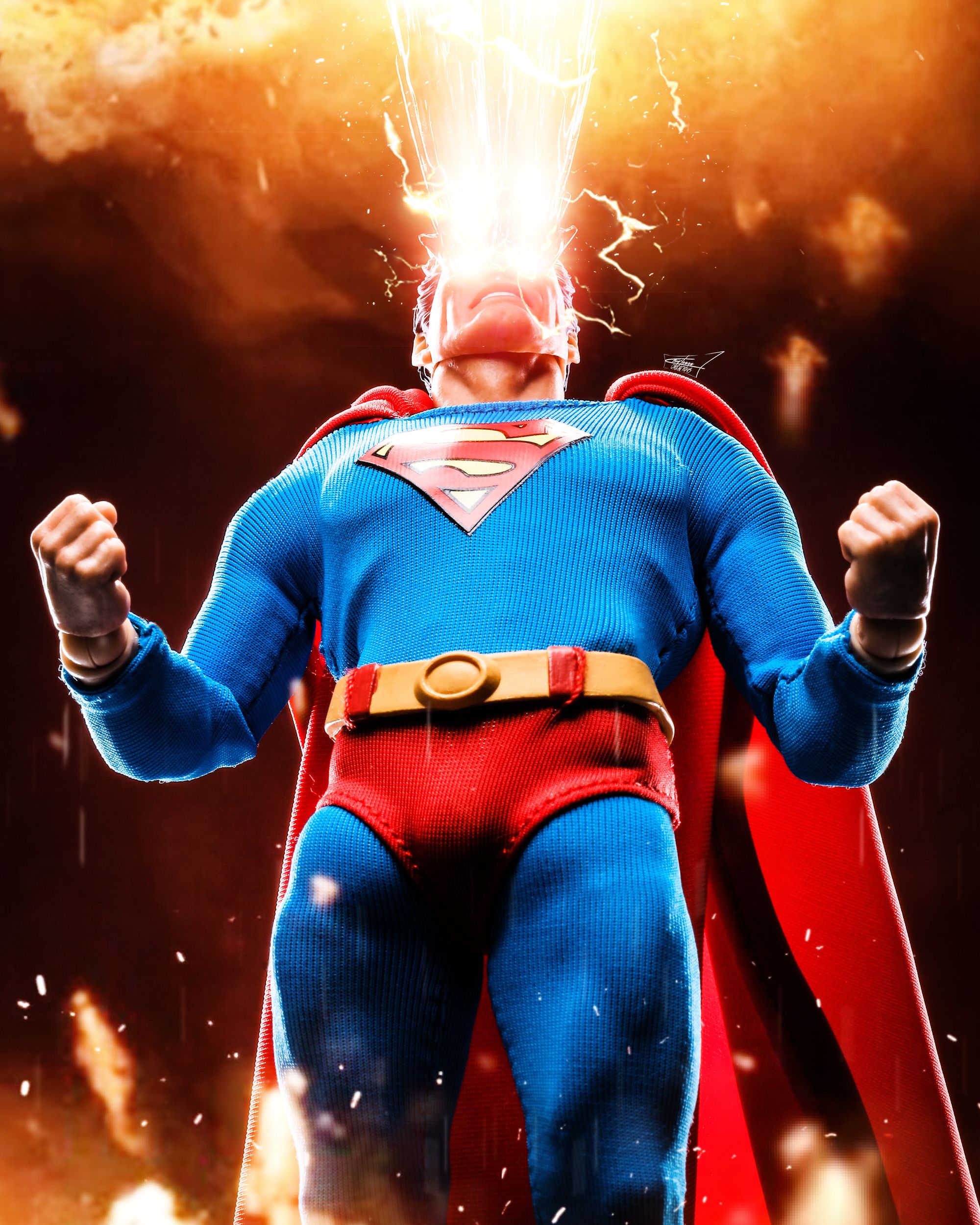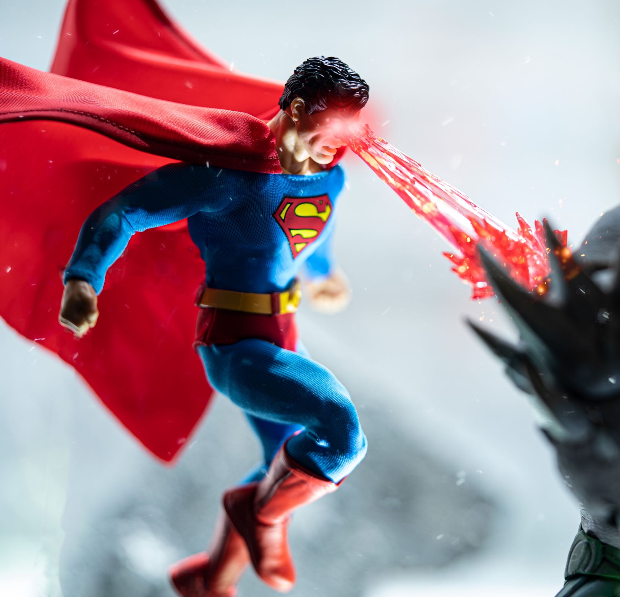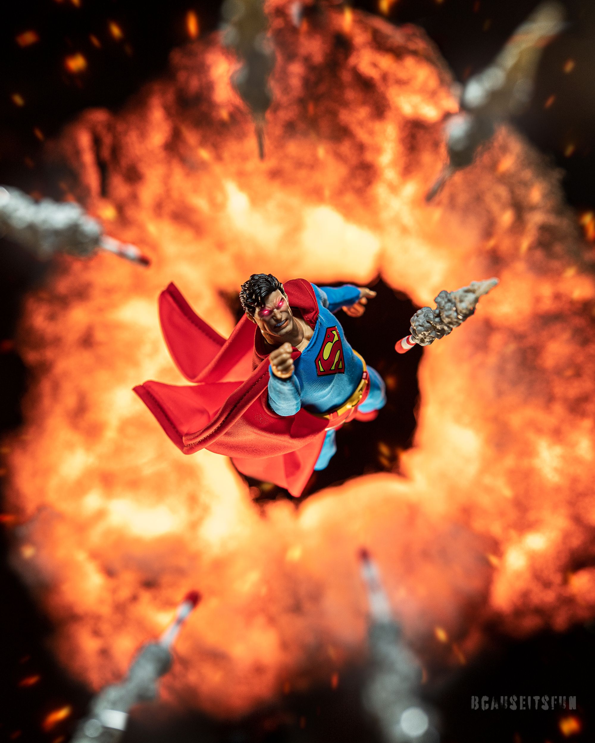 Inspiration: This figure has been a huge inspiration for me. Superman was my first introduction into the superhero genre back when I was a kid. This figure really brought back that nostalgia for me. I love creating shots with explosions in the background. I created this specific effect just for this figure. My idea was that Superman would be flying through an explosion. While looking through my many Mezco accessories I saw the missile from my Black Skull figure which gave me the idea of a barrage of them coming at Superman.