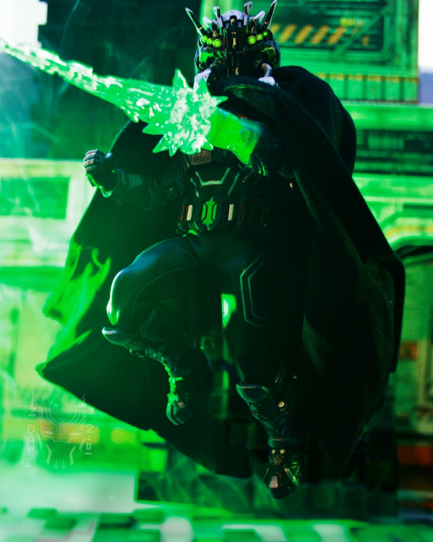 Inspiration: The inspiration from the shot came from the original promo video. There was a quick scene where Olumu was flying up in the air with his sword drawn and I liked it and wanted to recreate something similar. I wanted to highlight all the lime green accessories so I flooded the scene with green light and fog.