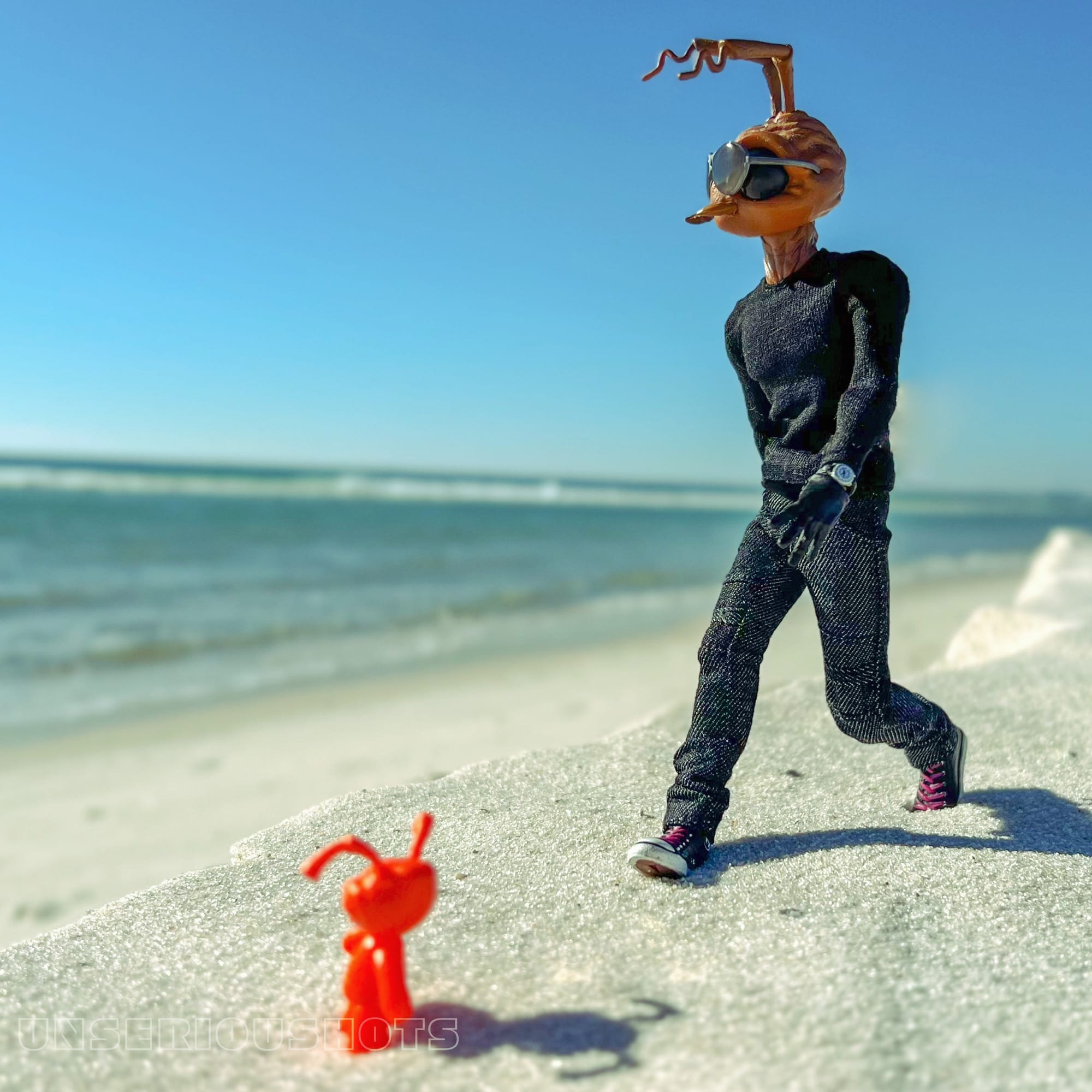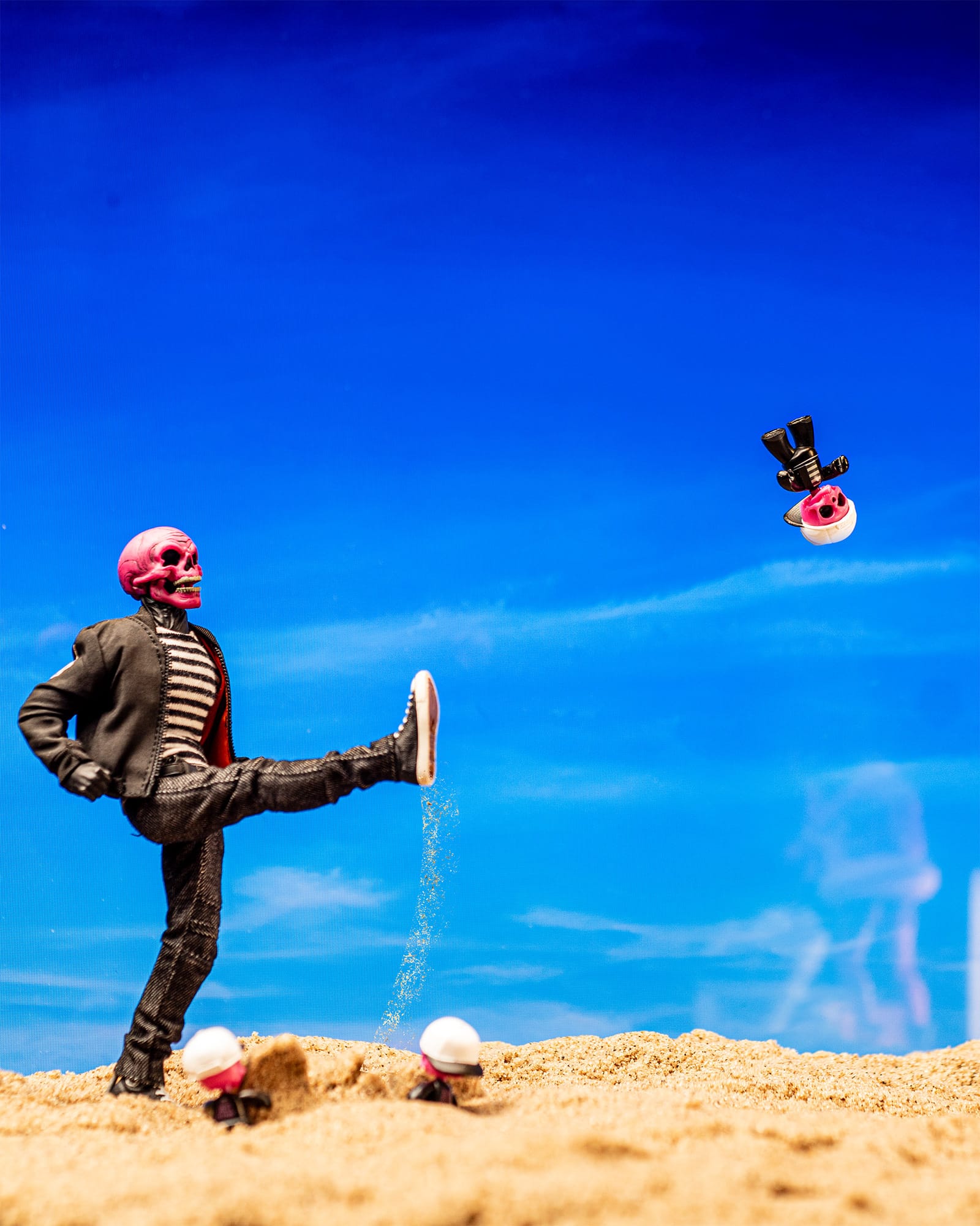 Inspiration: This photo was part of a series I created depicting a beach scene with the PSCC. This one, titled "The Boot" is exactly how I would expect the Pink Skulls to react/respond to little Mezits at the beach.