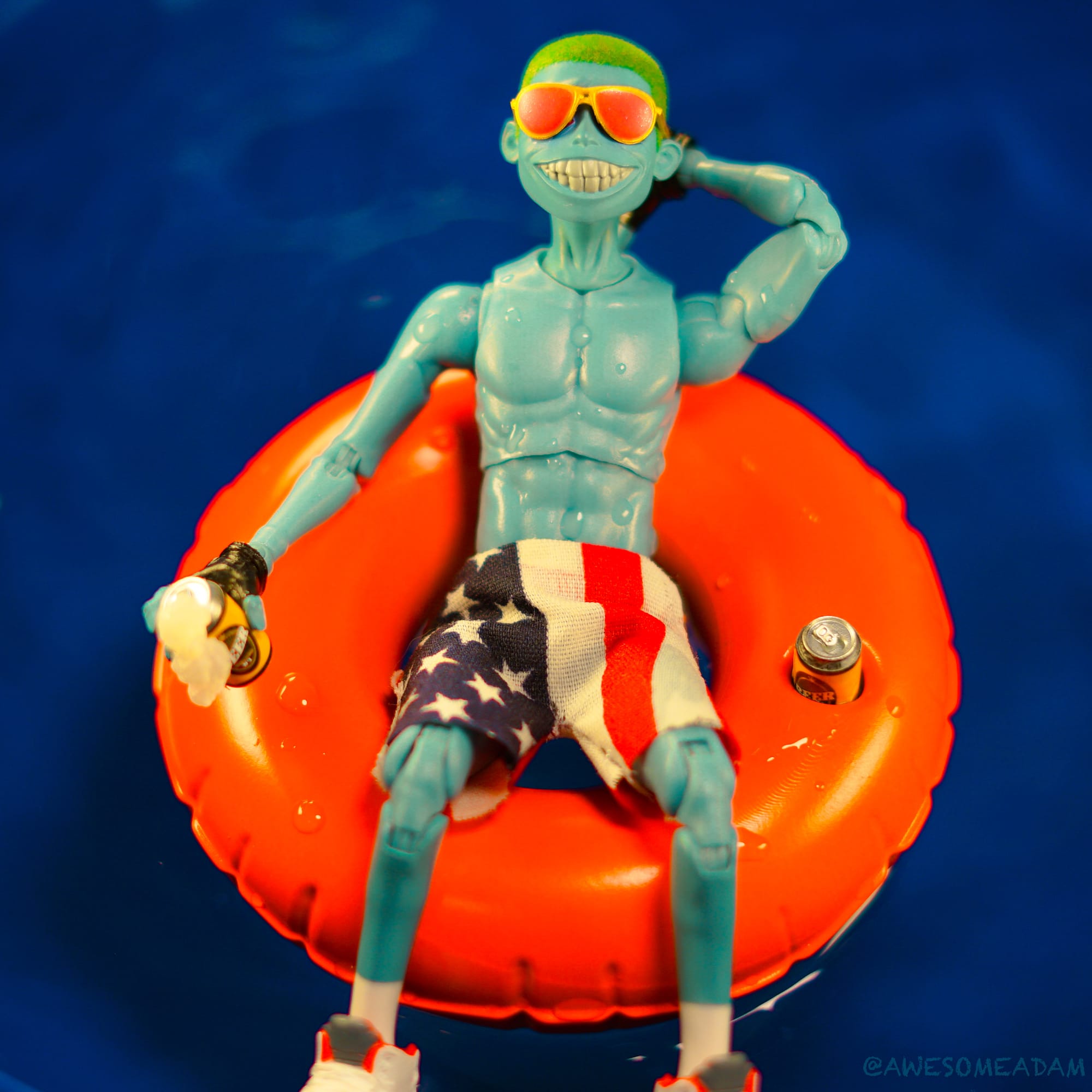 Inspiration: It was 4th of July week and itās been hot lately, so I felt like Vapor chilling out with his favorite beverage and favorite patriotic shorts in the pool was needed. I had made the shorts and pool tube which was a lot of fun. Vapor is one of my favorite Mezco toys and is so versatile he can do anything.