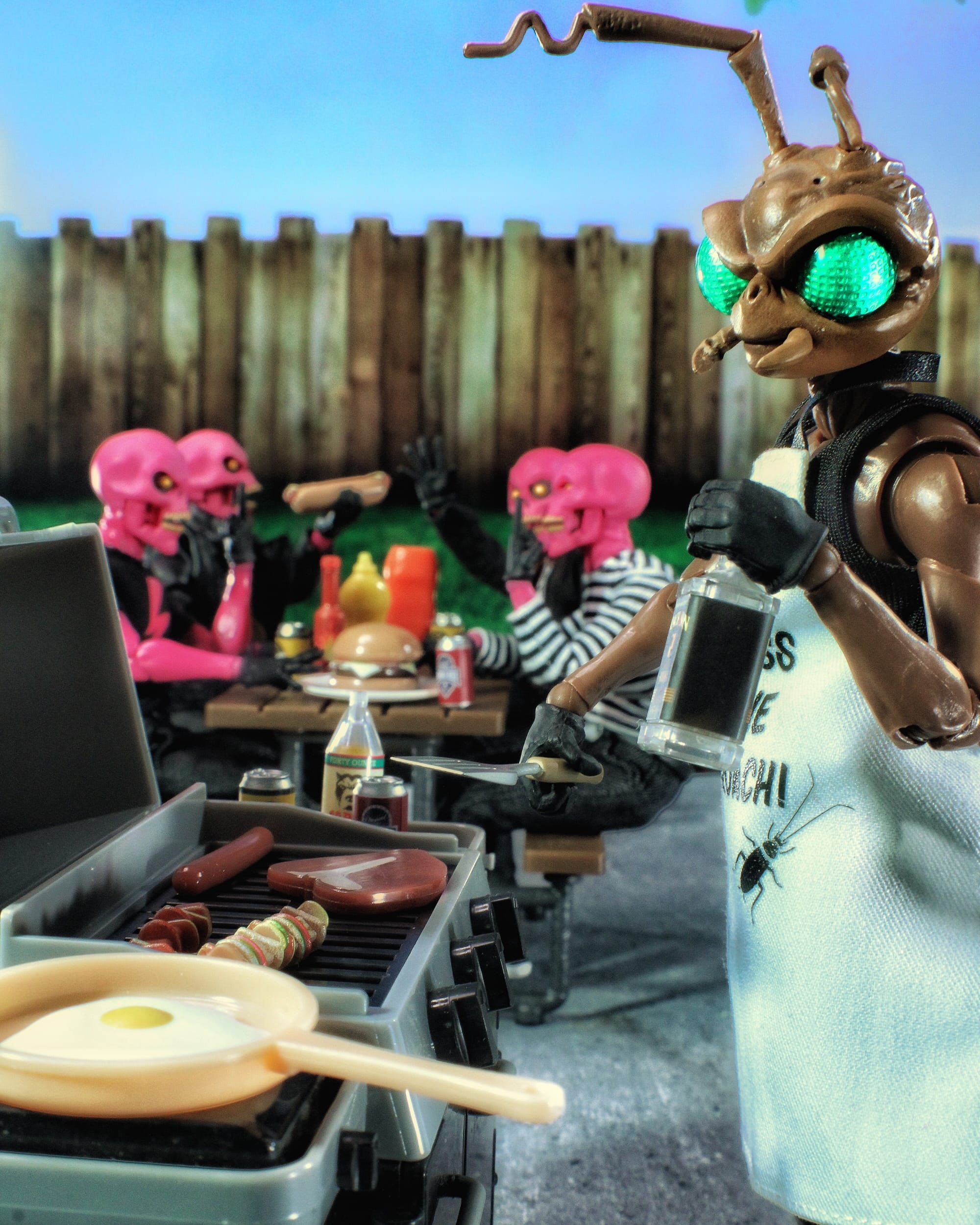 Inspiration: This photo was a 4th of July post inspired by getting together with friends to enjoy a cookout with good food and drinks. There's always a grill master trying to keep the hungry guests fed and I knew Gomez trying to keep up with the Pink Skulls appetites was the perfect way to represent that.