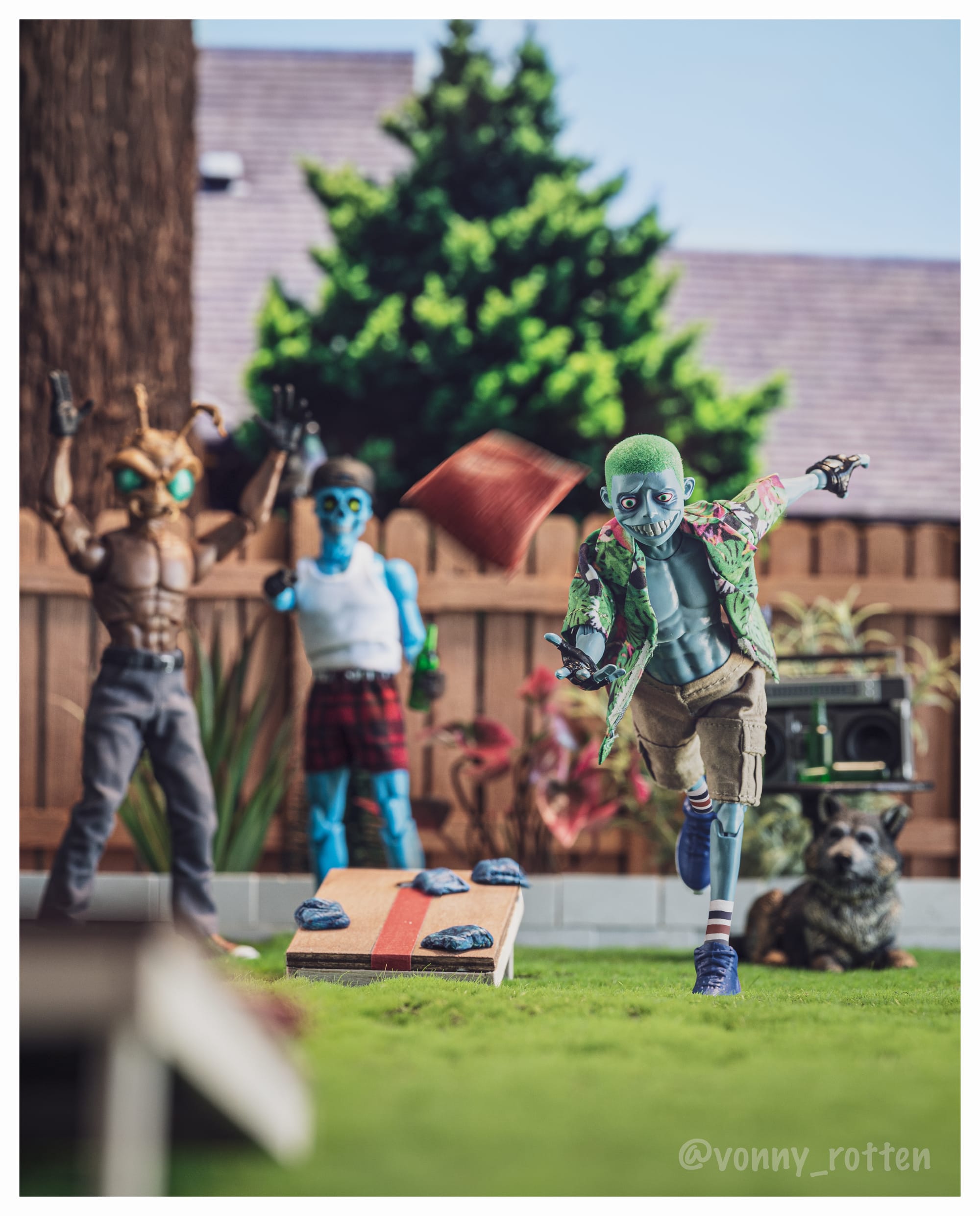 Inspiration: I wanted the scene to portray some summertime fun. I had already done a pool table shot and a ping pong shot with Vapor, so this idea of corn hole was just another game/sport idea I had for a long time. I had made the corn hole boards months before I shot it, and for whatever reason I finally took the time to figure out how/what I was going to use for the ābean bagsā, which I ended up using an epoxy sculpt to make them.