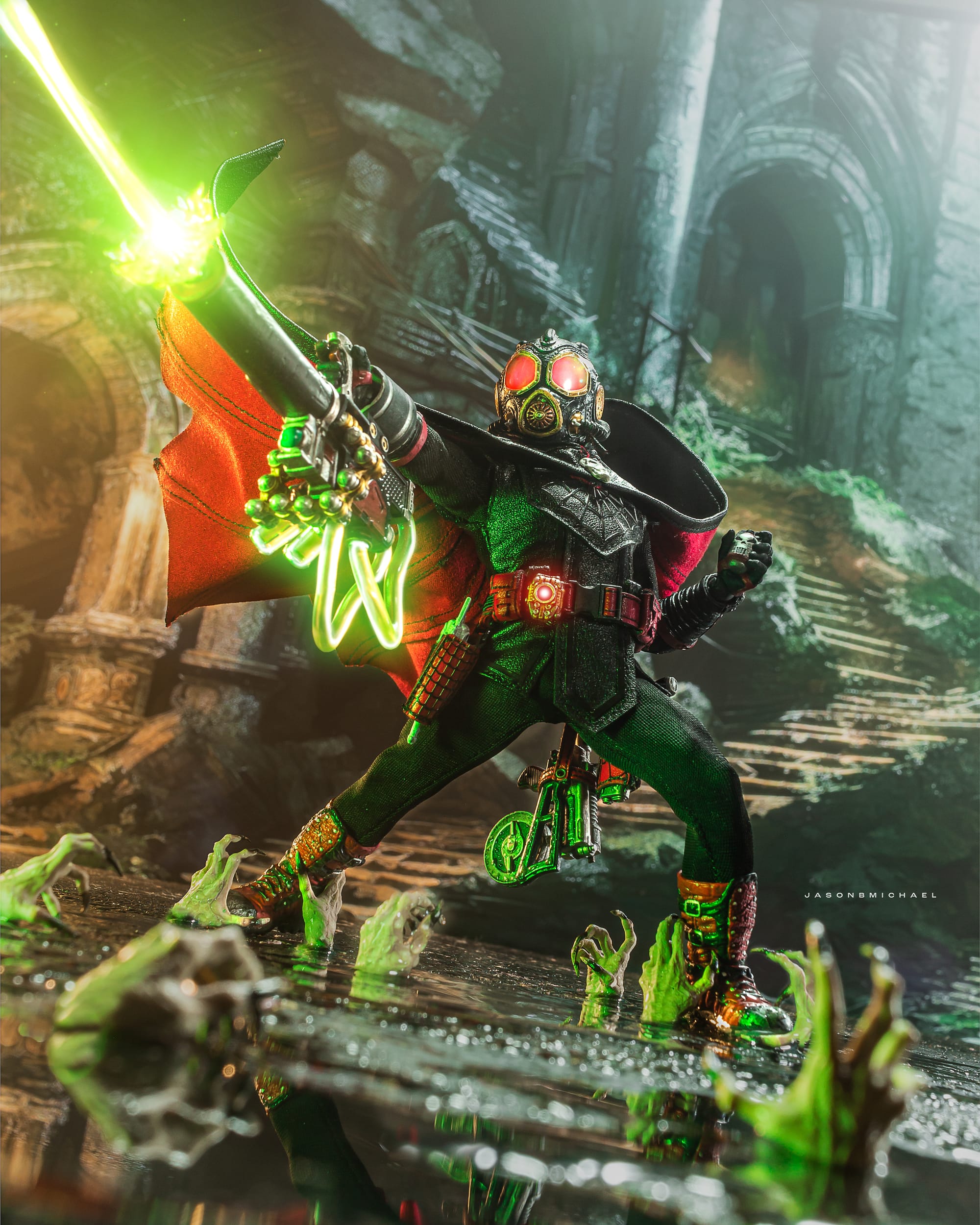 Inspiration: To convey Doc Nocturnal’s war against the forces of evil, I wanted to have him in action warding off monsters in ancient cavernous ruins. Because he fights a vampire in the first comic book, I figured I’d use vampire hands to act as beings trying to pull him into the dark depths of the Necroverse.
