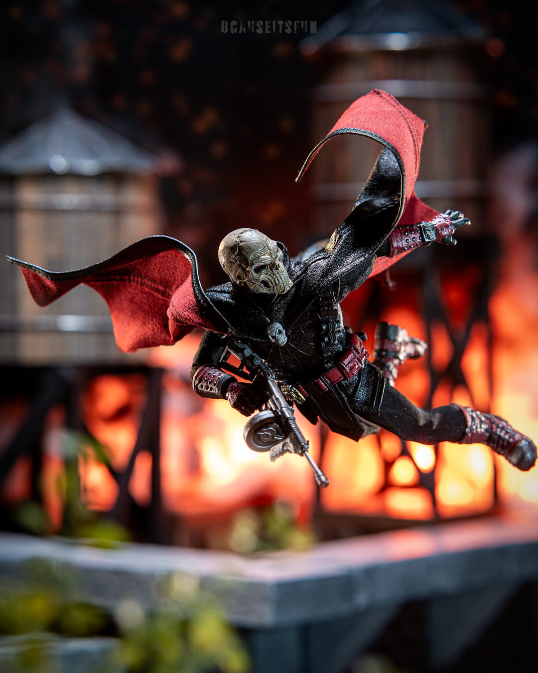 Inspiration: For this photo, I wanted to go back to something I used to do regularly and had not done in a while which was my blurry explosion background. I wanted to showcase the amazing cape on Doc Nocturnal so I thought a shot of him jumping off a rooftop escaping an explosion was just right.