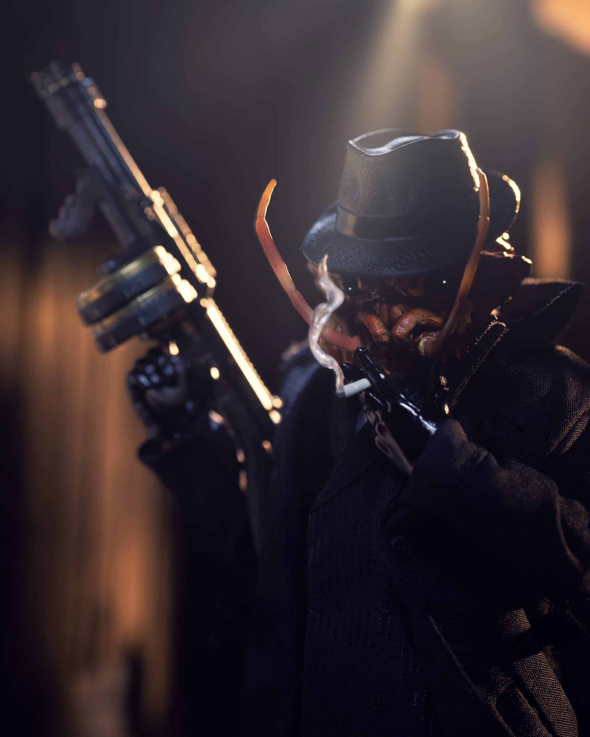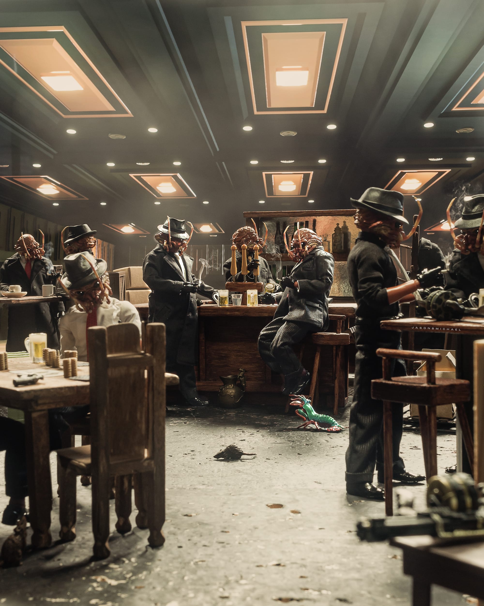 Inspiration: The Decapods have a very distinct gangster vibe, and that is a film genre I love. As a result, I wanted to combine the bar from the Sopranos, mixed with the color palette of the Godfather and the feel of Peaky Blinders, into the photos I made for these particular figures. This also allowed me to use the bar my father built for me some time ago. It's a wonderful prop I want to use more often.