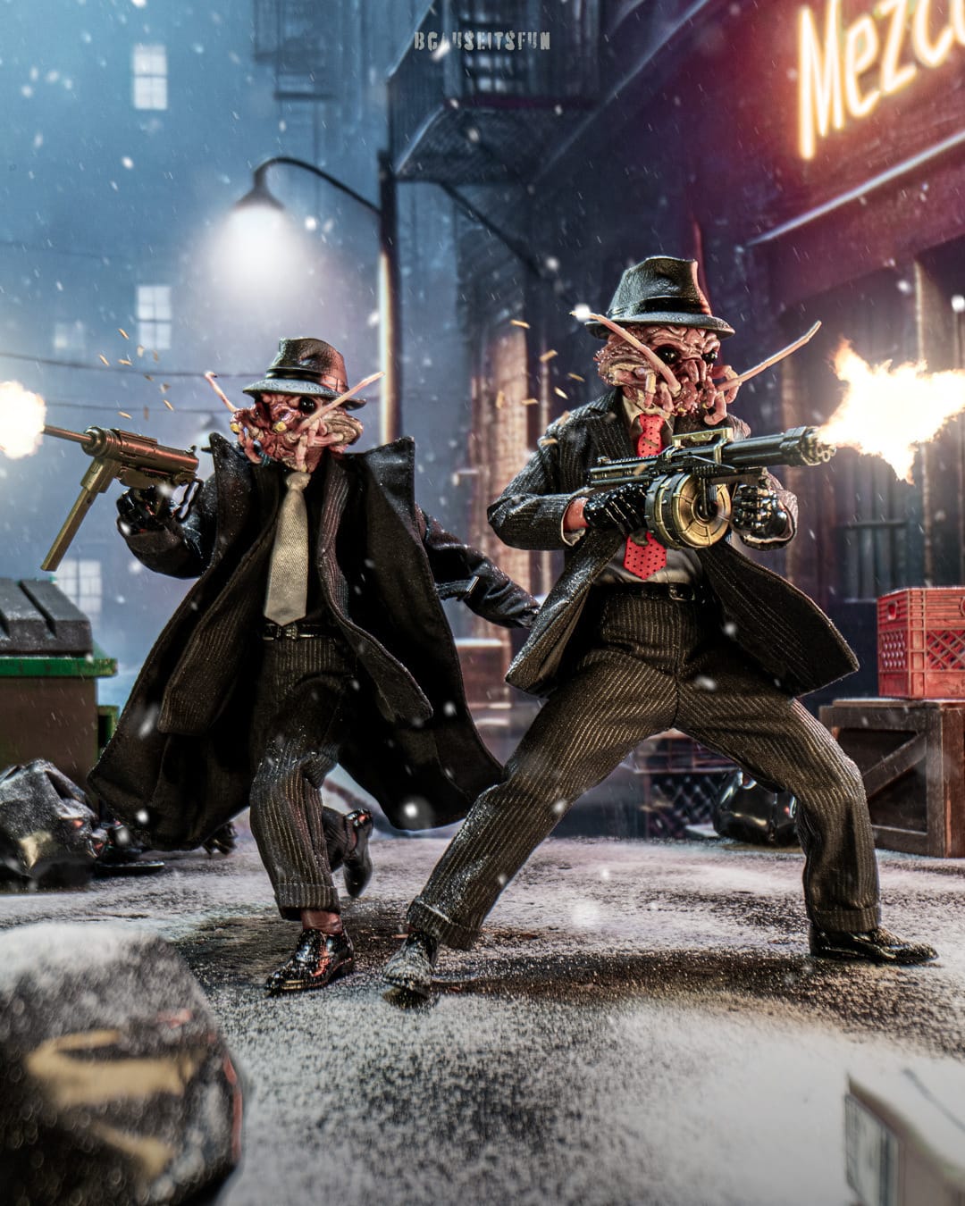 Inspiration: What inspired me for this photograph was the style of these characters. I pictured in my mind a couple of gangsters in a dark back alley with cold snowy conditions involved in a shootout. I also wanted to incorporate a Mezco neon sign in the background like I did in a previous photo. But just a little more subtle this time.