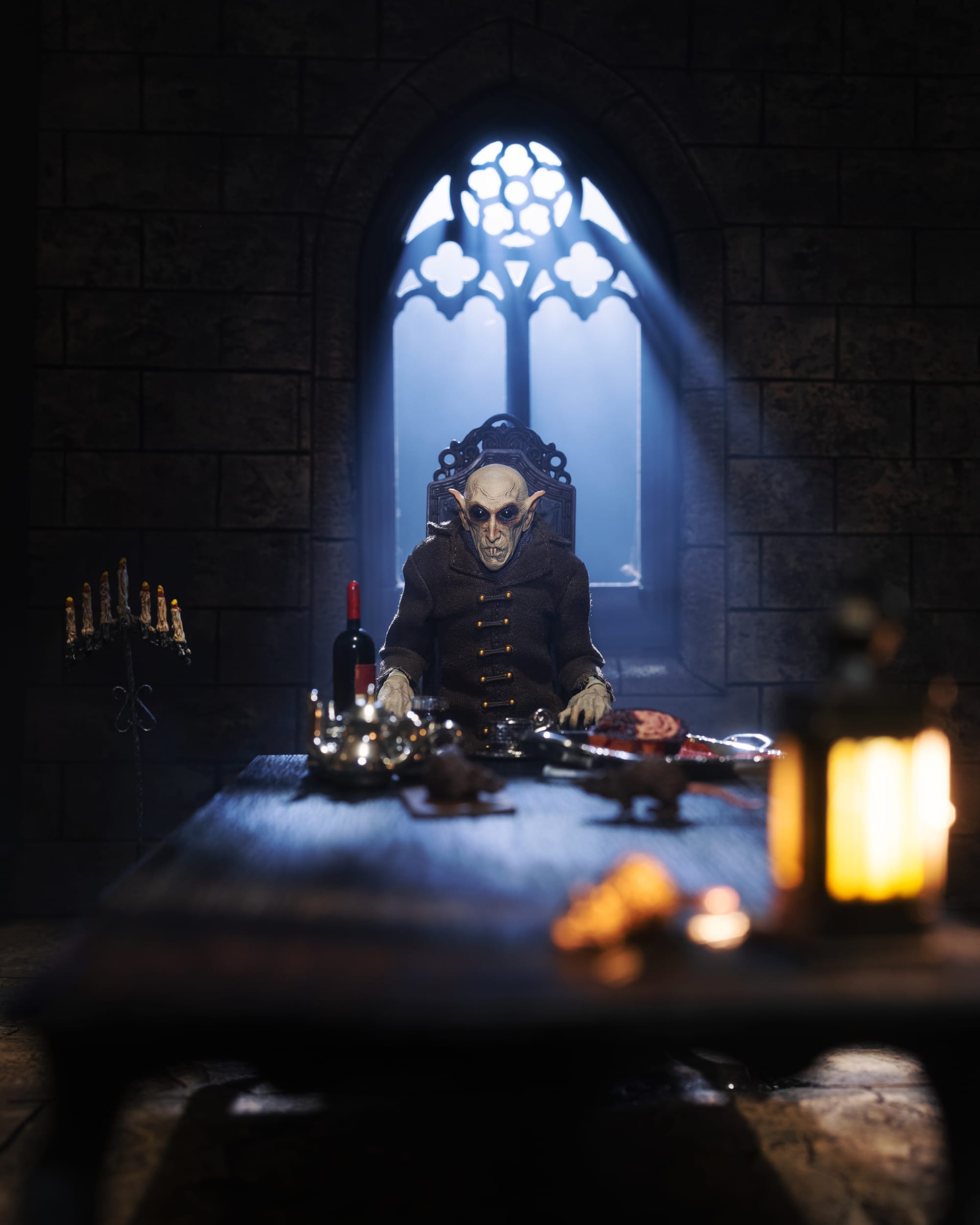 Inspiration: I imagined what a dinner at Count Orlok's castle would be like, so I played with lights, shadows, and a little smoke.