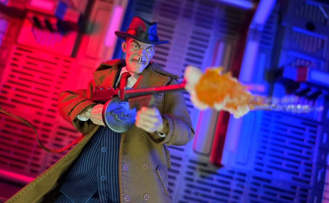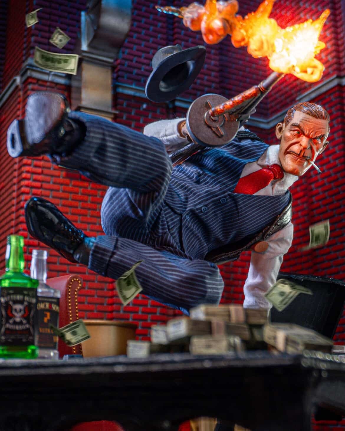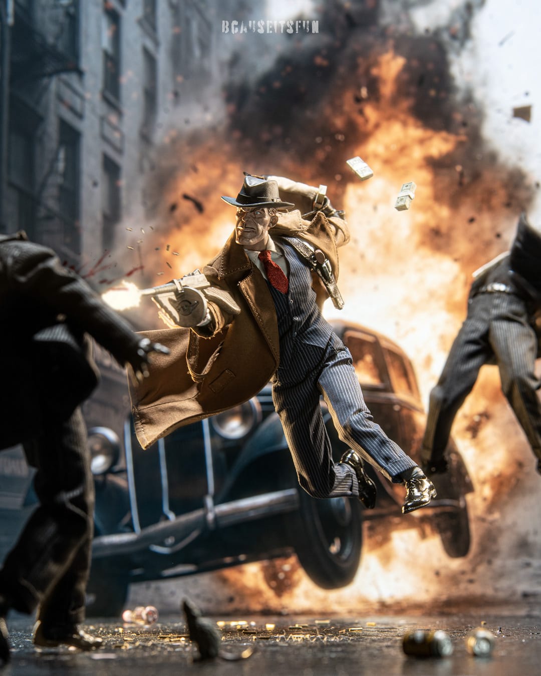 Inspiration: The moment I got this figure, I knew he belonged in pure chaos. Explosive backgrounds are my thing, so I pictured a 1920s-era car erupting in flames and bullets flying in the street. I wanted one thing to be crystal clear in this shot, just how much of a badass ole Sparky really is.