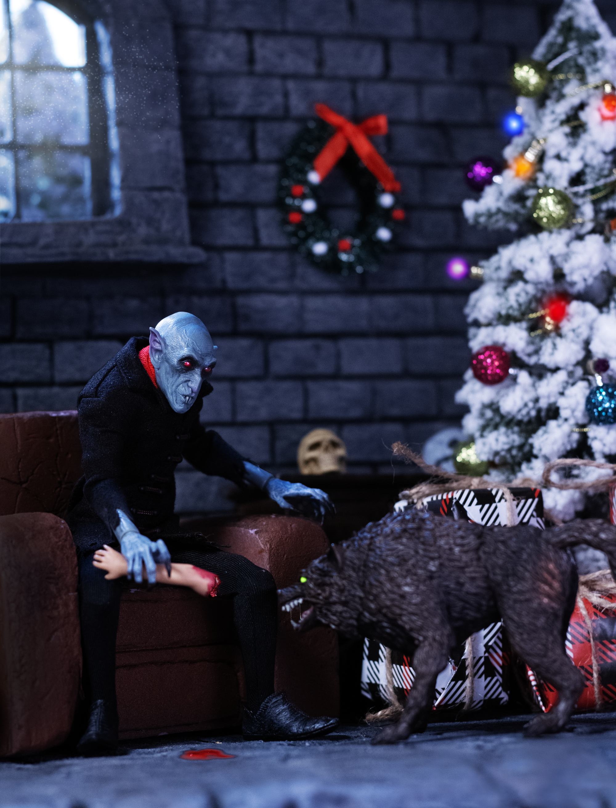 Inspiration: The inspiration behind this photo was to capture the Christmas vibe with a twist of my own style. As a huge fan of Mezco, I've been taking photos for over a year, initially focusing on horror themes. When my kids got interested, I lightened the tone and mood, creating fun and playful images. For this one, I imagined Count Orlok gifting this to one of his hellhounds on Christmas morning - why not? It's about bringing holiday cheer to the creepers in the dark!