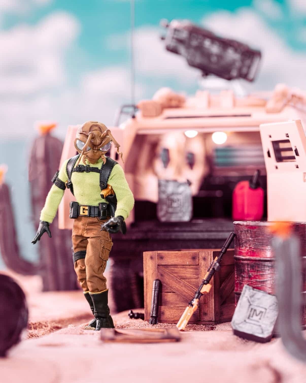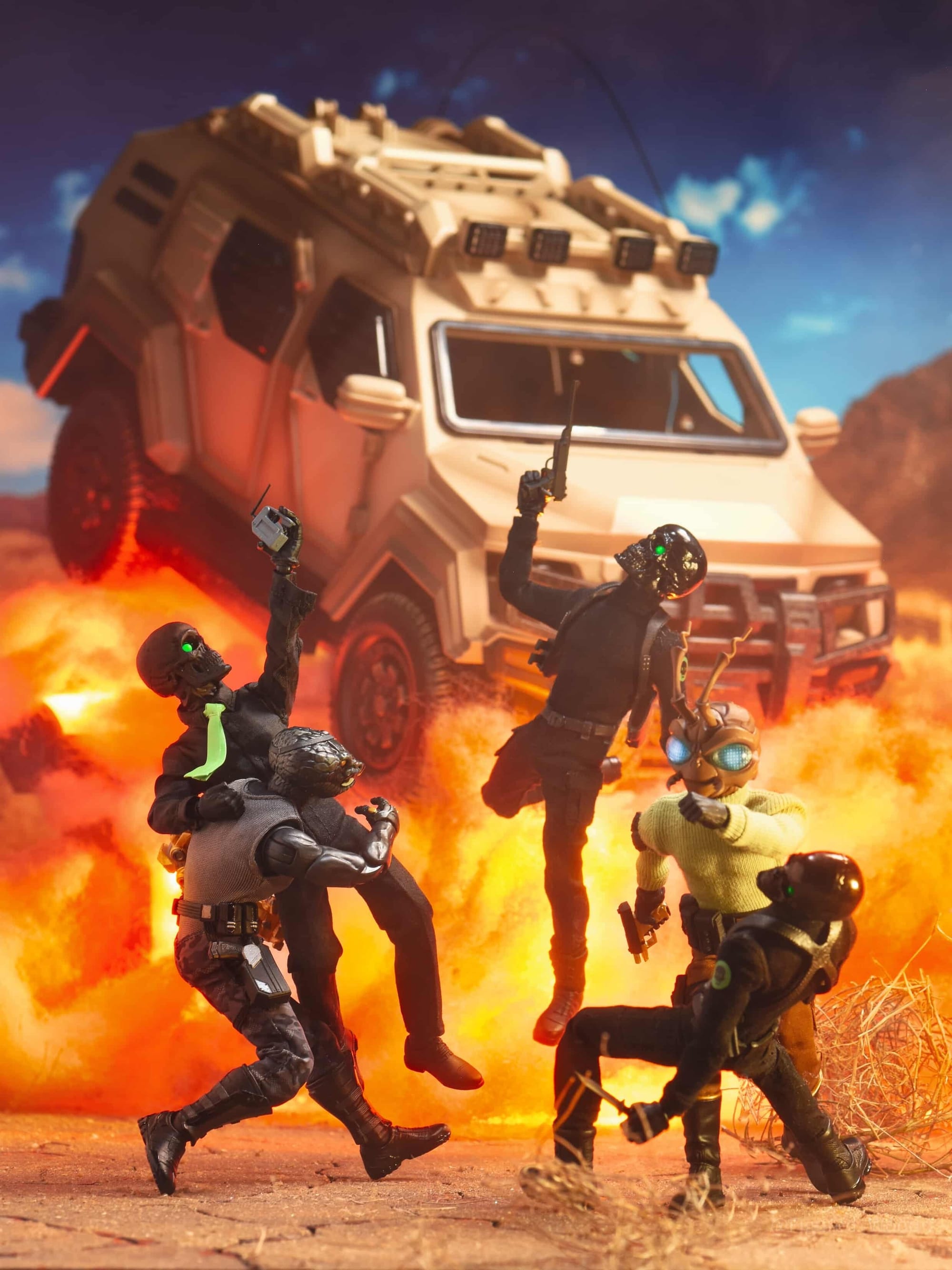 Inspiration: I was inspired to shoot a desert action scene with the awesome sandstorm paint job on the RUMBLR. I included a tumbleweed from my own yard!