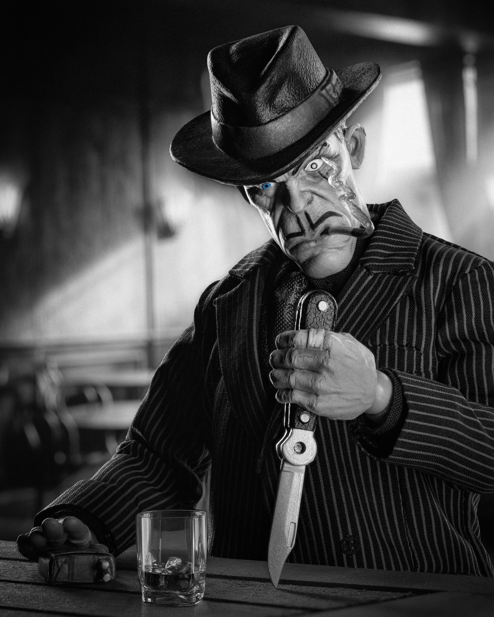 Inspiration: Living in Chicago, not too far from The Green Mill, the legendary bar tied to Al Capone, I wanted to give Sparky his own classic gangster bar moment. The whiskey glass felt like a must, and the knife adds just enough tension to suggest he is carving something into the bar. And with a name like Sparky, the cigarette pack in his other hand had to be part of the scene. I’m drawn to images that imply a story without spelling it out, and this one feels like you have walked in at exactly the wrong time.