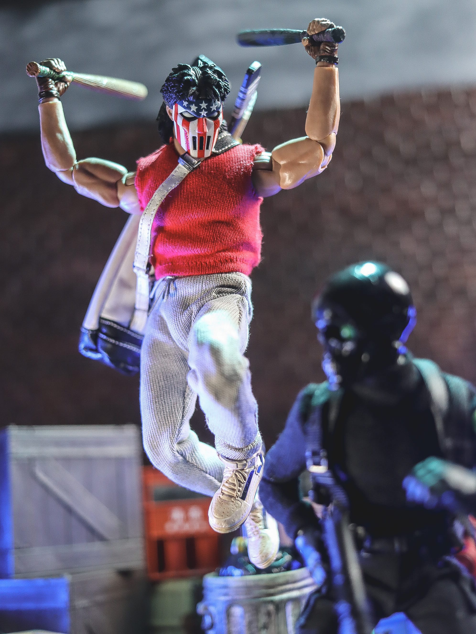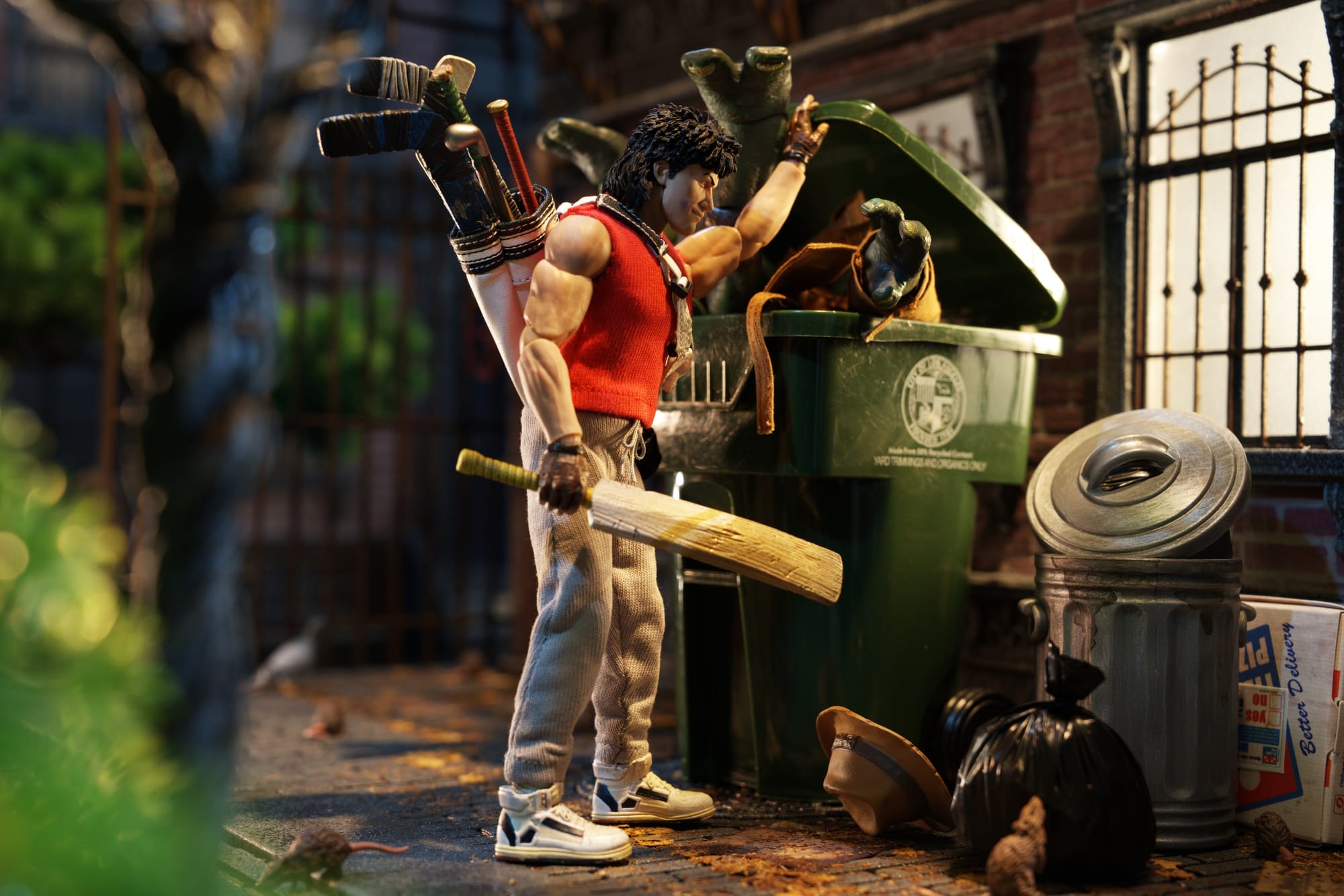 Inspiration: I had the idea for this photo for over a year and a half after getting the little green waste bin at my kid's preschool, and it's loosely inspired by the Casey and Raph meeting in the 1990 TMNT movie. Life got in the way, and I never got around to doing the shot until now. But I'm glad I waited, because I'm loving the look of this new Casey Jones!