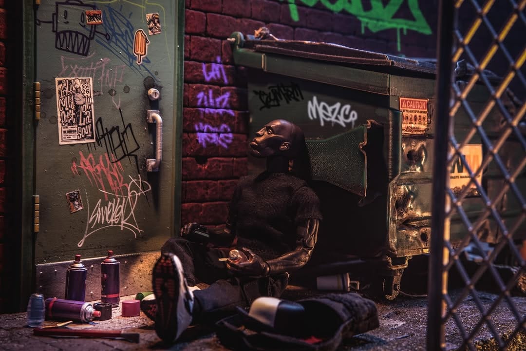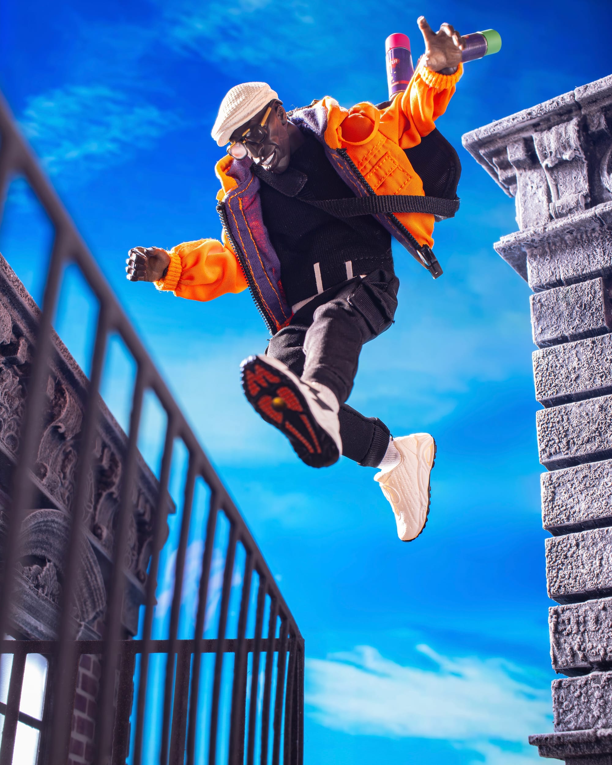 Inspiration: I wanted to capture Letterman in the middle of his day, scaling New York rooftops between tagging some hard-to-reach spots. I really liked the smiling head sculpt he came with, and thought it perfectly conveyed the fun he’s having