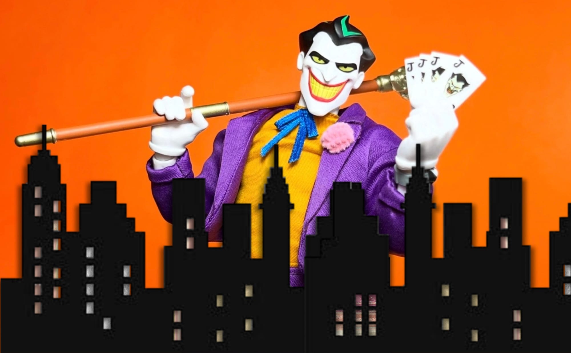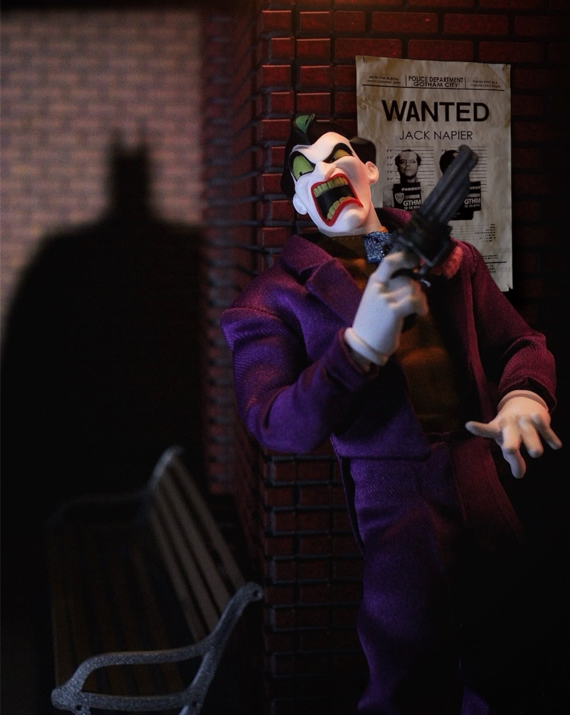 Inspiration: My inspiration for this shot comes from the feeling that, in the Batman universe, especially in TAS, the Joker is a larger-than-life villain who is always lurking in Gotham City, enjoying it as if it were his own playground.