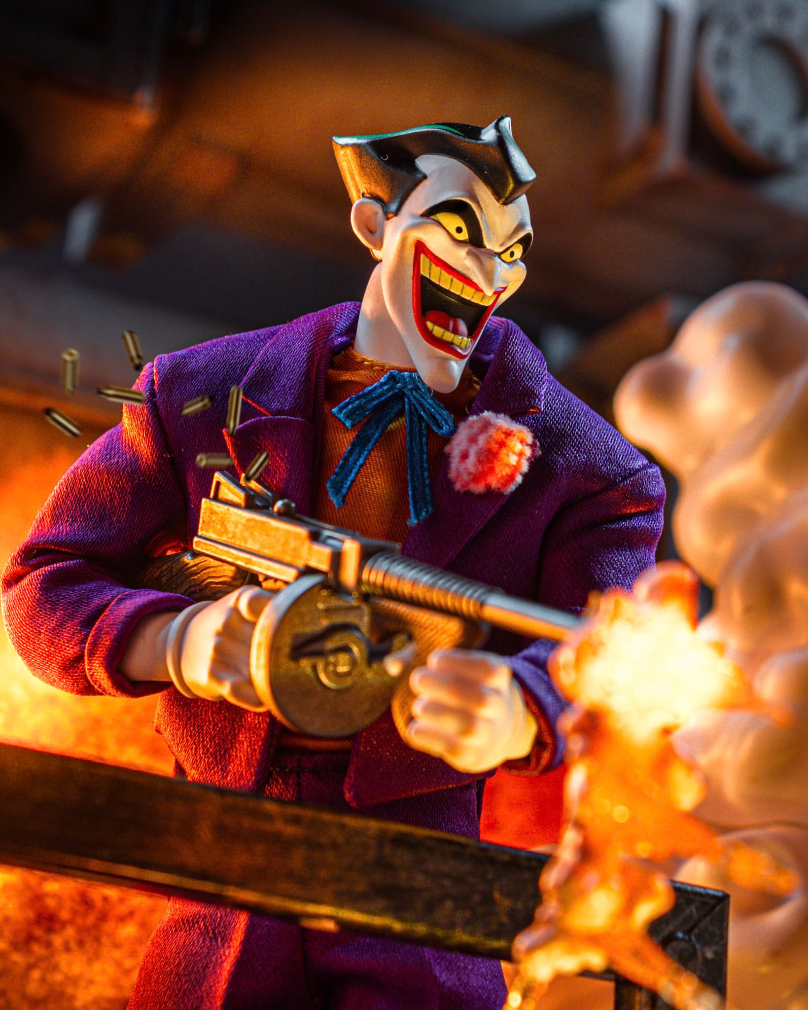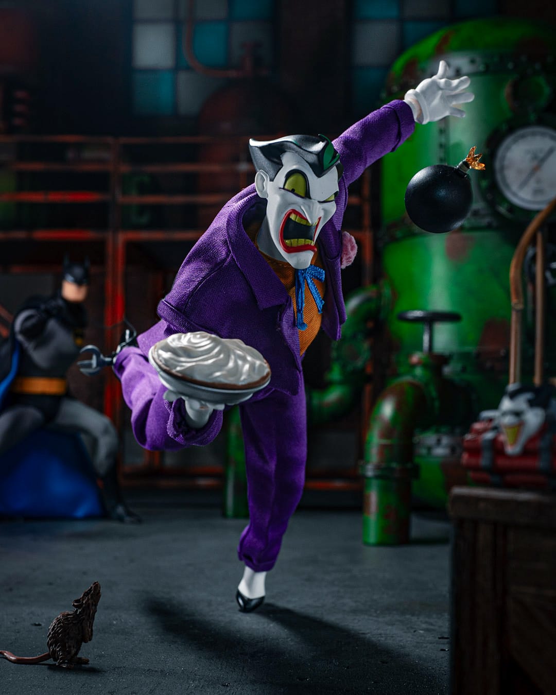 Inspiration: I wanted to showcase some accessories as well as this amazing head sculpt. To also show how well this figure can move, I had Batman tripping Joker with his grapnel, causing him to drop the lit bomb while trying to save the pie. I really enjoy how expressive this Joker is and hope to see more villains.