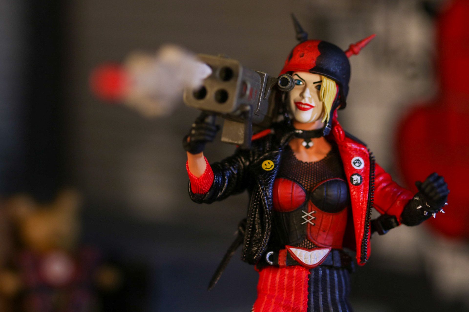 Inspiration behind the photo: "The attitude of the figure. This interpretation of Harley Quinn screams IDGAF. Armed with a leather jacket, spiked helmet, and a bazooka, she’s ready to cause chaos. She seems as if she’d be right at home testing out her bazooka in some back alley in Gotham, daring Batman to get a load of her new toy."