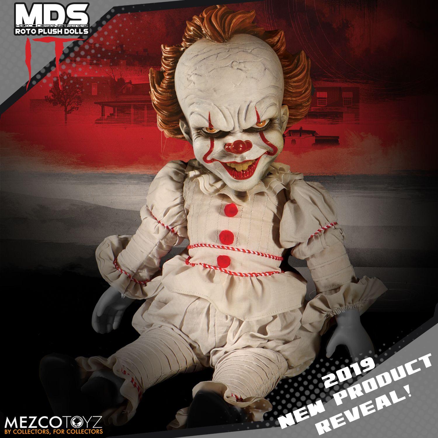 Mezco Designer Series Roto Plush Pennywise is 18" tall and features an intricately tailored costume over a plush body. The sculpted head is detailed with a maniacal grin and threatening eyes.