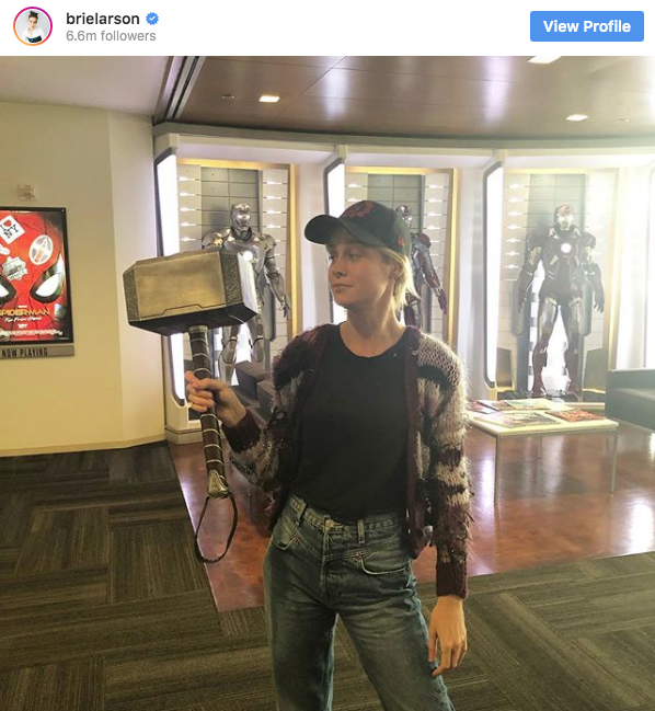 The actress behind Marvel’s latest fan-favorite superhero Captain Marvel posted a picture on Instagram on Wednesday of her holding Thor’s famous hammer, Mjölnir. Larson, 29, seems to be posing at some sort of office for Marvel Studios, as past Iron Man suits line the wall behind her.